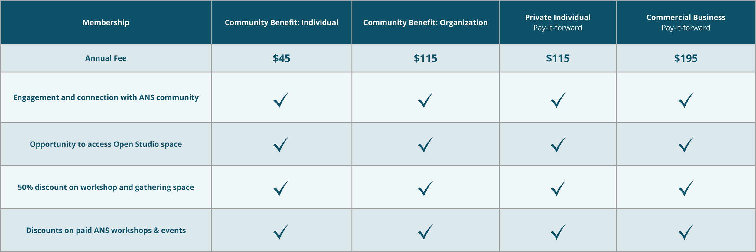 Describe what open studio space is. Art Not Shame is available for rent by individuals and organizations for to run workshops, use it as a practice space, blah blah blah. Our space is typically rented x number of times in the week, and is open for drop-ins on Mondays 10am until 4pm, and Thursdays from 3pm until 5pm. When the space is not being rented, it is available for Open Studio use - meaning, if you have an Art Not Shame membership, you can use the space whenever it’s free! You’ll be granted access to a calendar to be able to check weekly Open Studio times. Open Studio is for shared-use only. For individual/private use, your membership allows you to book the space at 50% off. CLARIFY WHETHER PPL WITH MEMBERSHIP CAN ACCESS SPACE AFTER HOURS AND/OR WITHOUT STAFF PRESENT.
